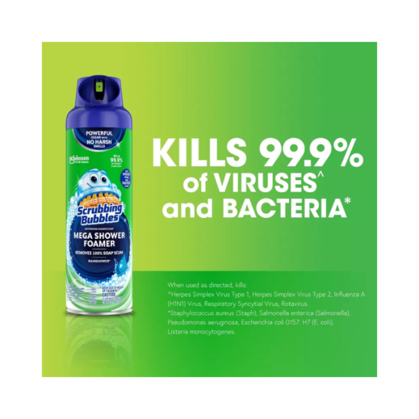 O Scrubbing Bubbles Mega Shower Foamer Aerosol é uma fórmula espumante que elimina 99,9% dos vírus^ e bactérias*. É um spray para chuveiro que age ao entrar em contato, removendo o calcário para uma limpeza poderosa e com um aroma incrível. Este spray desinfetante doméstico remove 100% dos resíduos de sabão. Sua espuma penetrante oferece o jato mais amplo e a limpeza mais rápida, ajudando a cobrir rapidamente a sujeira difícil do banheiro no chuveiro e na banheira. Esse desinfetante é um ótimo limpador geral para o banheiro e pode ser usado em superfícies como paredes do chuveiro, portas de vidro, azulejos cerâmicos esmaltados, porcelana esmaltada e muito mais. Esse espumante é conhecido por sua eficácia, além de seu “carisma”. Também disponível em spray com gatilho ajustável. Remova sujeira e resíduos de forma eficaz. Limpeza poderosa, sem cheiro forte. Quando usado conforme as instruções, elimina: ^Vírus Herpes Simplex Tipo 1, Herpes Simplex Tipo 2, Vírus Influenza A (H1N1), Vírus Respiratório Sincicial, Rotavírus. *Staphylococcus aureus (Staf), Salmonella enterica (Salmonela), Pseudomonas aeruginosa, Escherichia coli 0157: H7 (E. coli), Listeria monocytogenes.