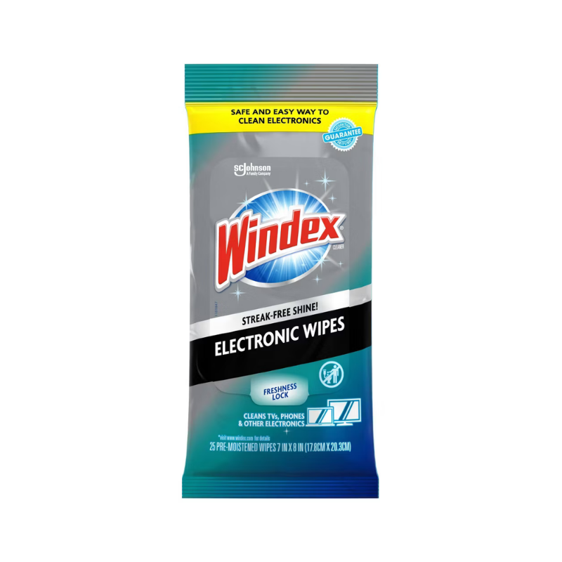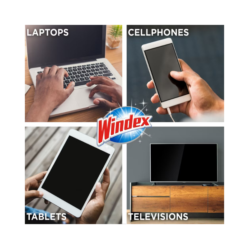Toalhas Umedecidas Windex® para Eletrônicos: Limpeza prática e segura para telas e dispositivos eletrônicos, removendo poeira e marcas sem danificar ou deixar resíduos. Ideais para smartphones, tablets, laptops, TVs e câmeras, essas toalhas sem amônia são fáceis de transportar e garantem brilho imediato.